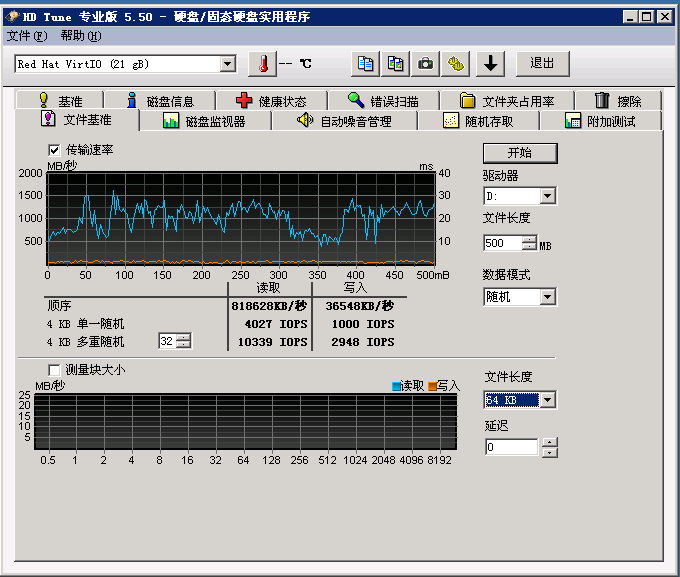 在网站WEB应用及数据库应用中,通常是若干随机小文件的读写,故存储的IOPS若太低则在高访问量的情况下可能会成为性能瓶颈。 用“HD Tune专业版5.50”中的“文件基准”功能可以测试